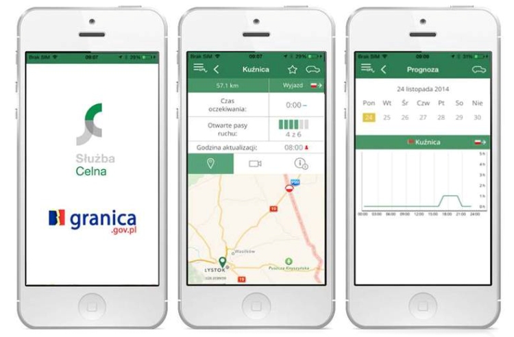 Bezpłatna aplikacja „Granica" wdrożona przez Służbę Celną to kolejna innowacyjna usługa* dla osób przekraczających granicę. Aplikacja, przygotowana na urządzenia mobilne, udostępnia informacje o aktualnej sytuacji na polskich, drogowych przejściach granicznych. Pozwala uzyskać informacje o długości kolejki, średnim czasie oczekiwania na odprawę, prognozach zmiany tego czasu w najbliższych godzinach. Daje możliwość zaplanowania i wyboru najdogodniejszego przejścia granicznego.