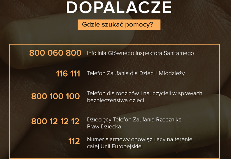 800 060 800 – Bezpłatna, całodobowa infolinia Głównego Inspektora Sanitarnego. Pod tym numerem telefonu możemy uzyskać informacje na temat negatywnych skutków zażywania dopalaczy oraz o możliwościach leczenia. Infolinia jest także przeznaczona dla rodziców, którzy mają wątpliwości czy ich dzieci zażywają dopalacze. Na infolinię GIS można przekazywać także informacje, które mogą ułatwić służbom dotarcie do osób handlujących tymi nielegalnymi substancjami.